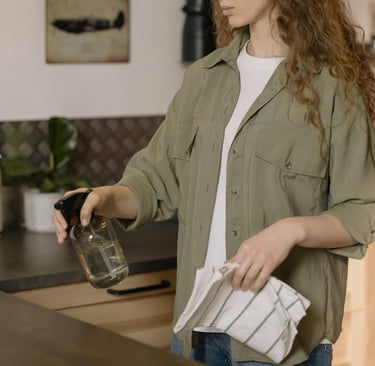 Désinfecter : On mélange du vinaigre blanc et de l'eau à part égal dans une bouteille à spray. On vaporise où on veut : les plans de travail, les tables, l'évier. Ca permet de tuer la plupart des bactéries et des moisissures.